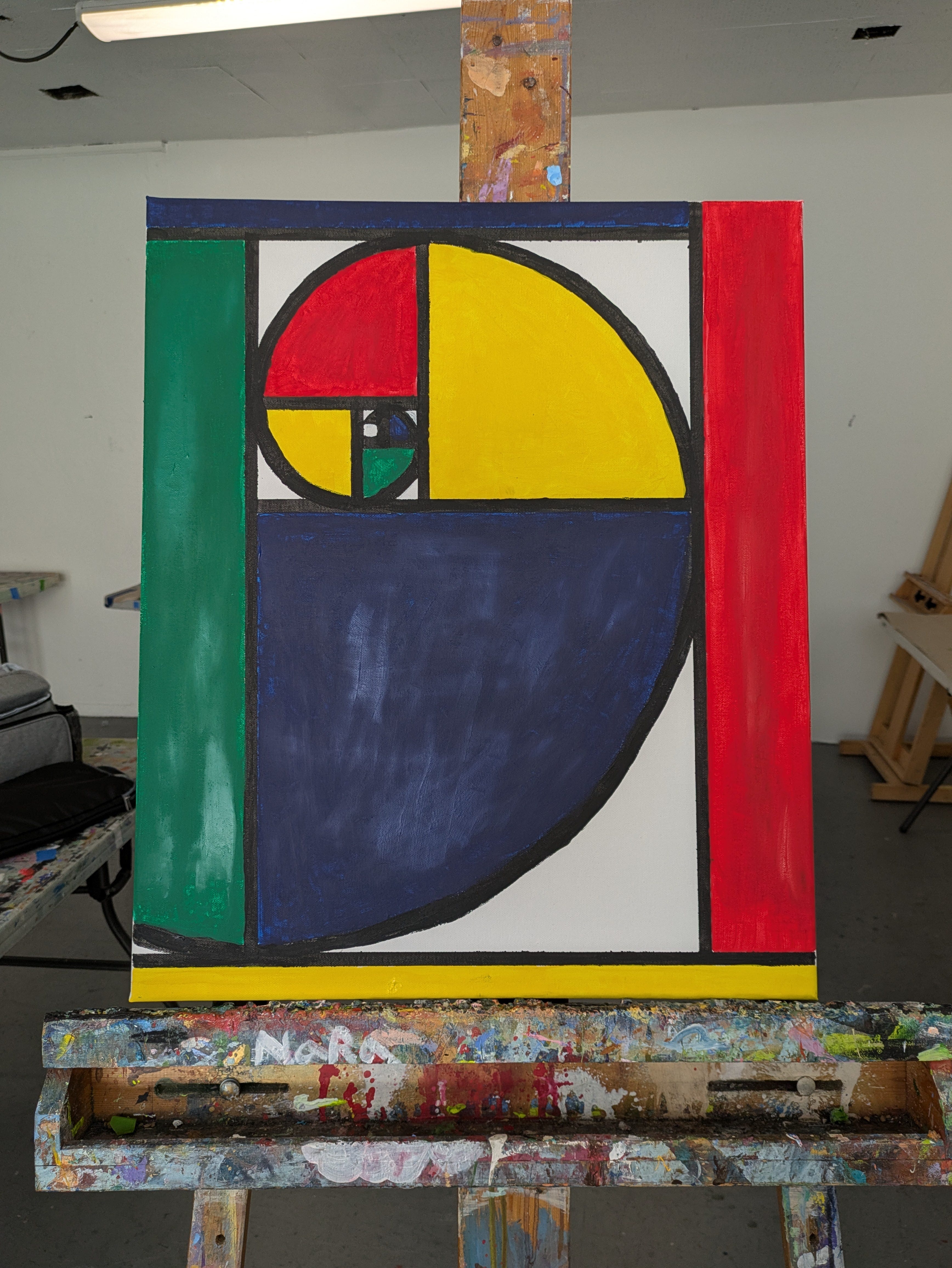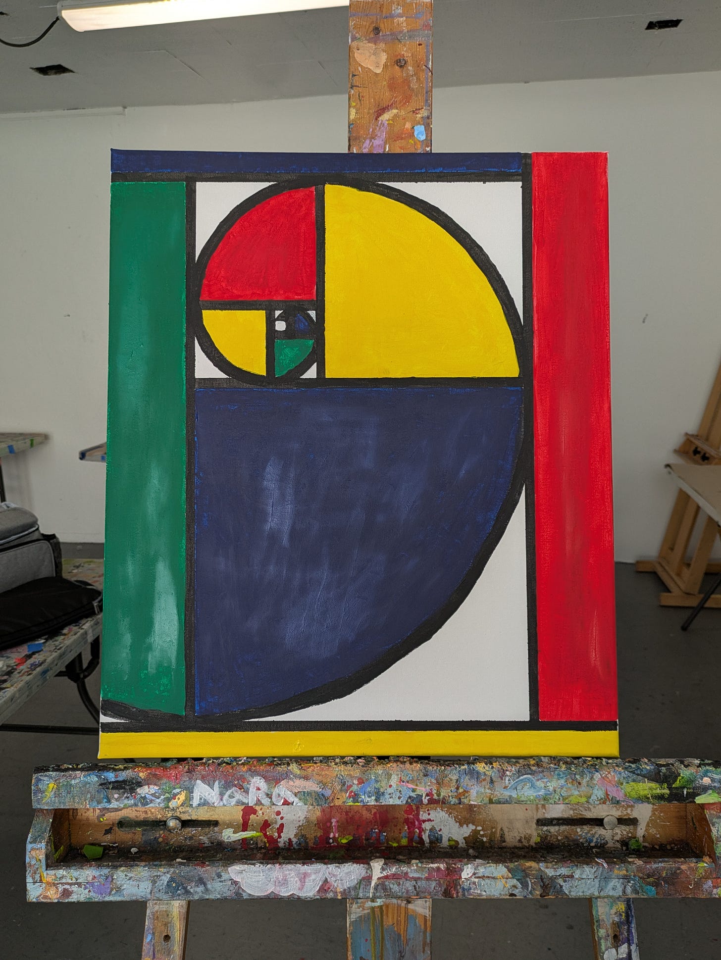 I made three practice paintings on acrylic paper before I moved on to painting on canvas. I decided to paint the golden spiral and rectangles in the style of Mondrian. It was challenging to develop a vision and strategy for measuring and drawing the spiral; using masking tape to ensure straight lines; composing the digital draft; and then attempting to paint with precision and evenness.
